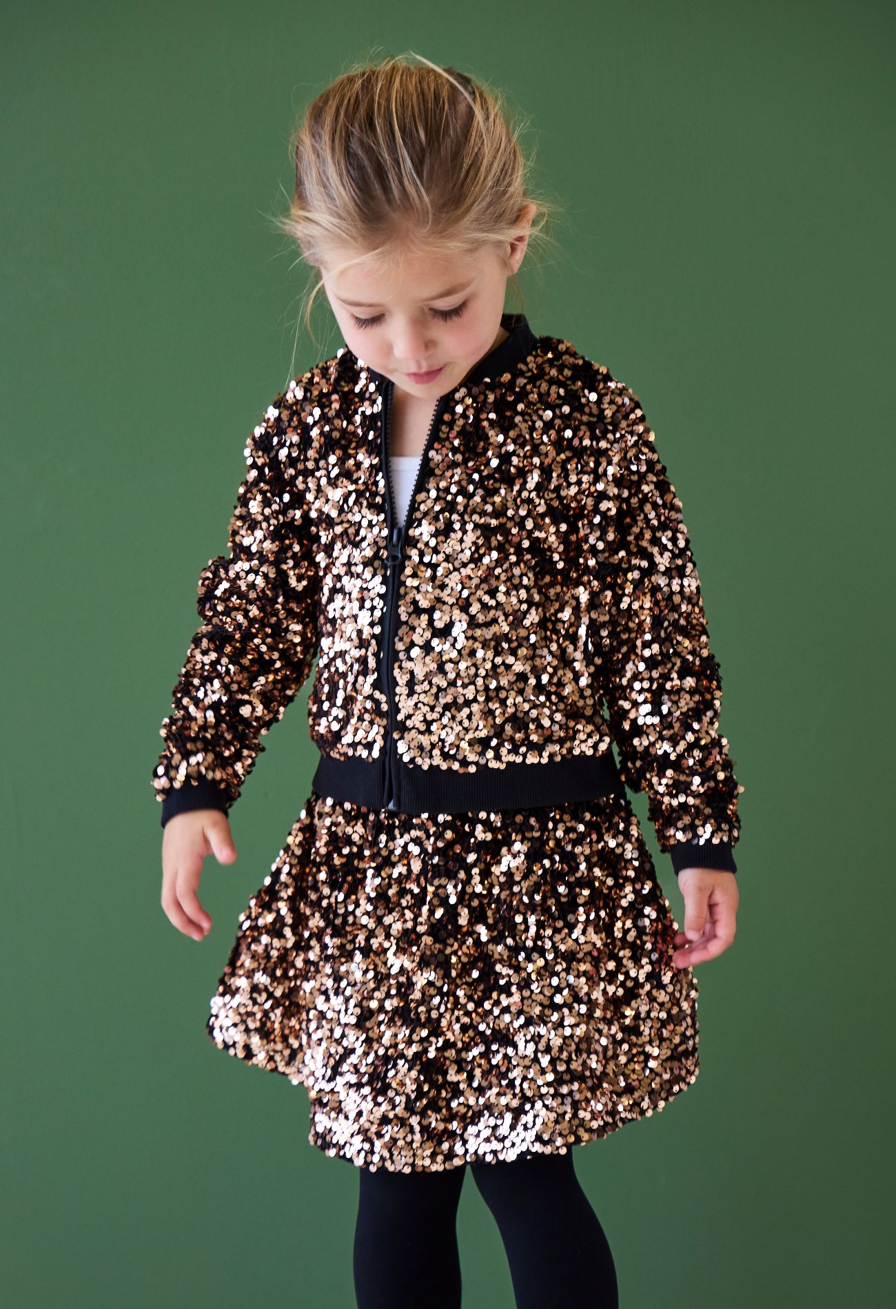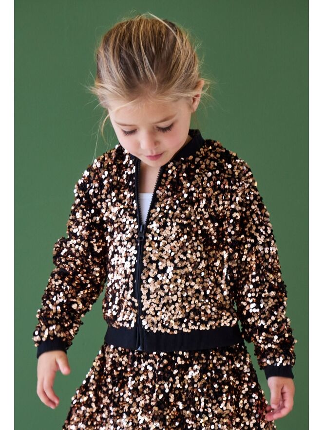 Dit bomberjack voor meisjes is gemaakt van een zachte velvet stof die rijkelijk is versierd met pailletten, perfect voor een feestelijke look. Het jack heeft een sportieve pasvorm met geribde boorden en een ritssluiting aan de voorkant. Combineer met het bijpassende rokje (W10514) voor een complete, sprankelende outfit.