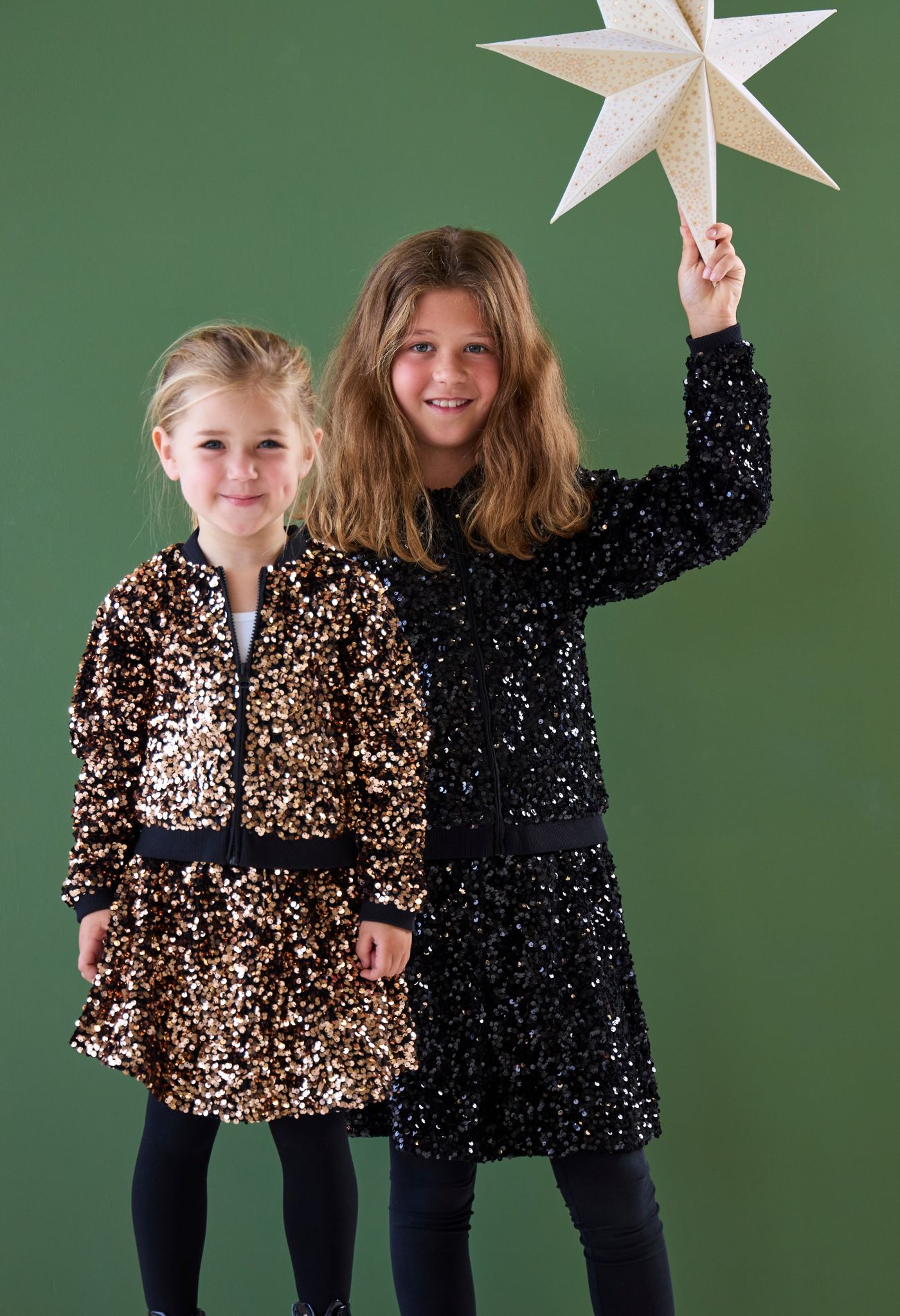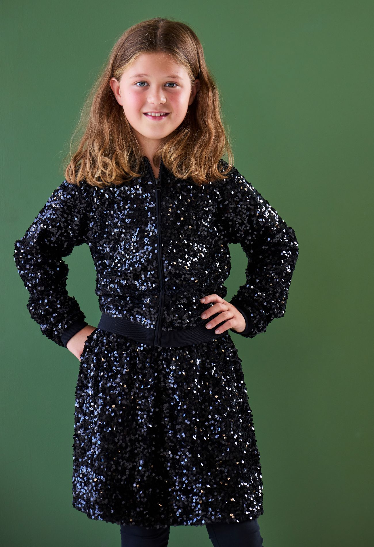 Dit bomberjack voor meisjes is gemaakt van een zachte velvet stof die rijkelijk is versierd met pailletten, perfect voor een feestelijke look. Het jack heeft een sportieve pasvorm met geribde boorden en een ritssluiting aan de voorkant. Combineer met het bijpassende rokje (W10514) voor een complete, sprankelende outfit.