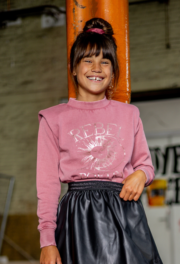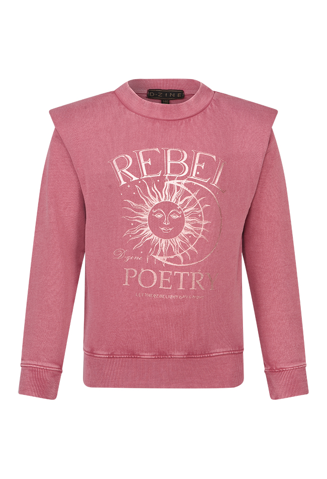 Trui van D-zine. De trui heeft een acid wash/verwassen look met een print op de voorkant. Valt iets oversized. Materiaal: 95% katoen, 5% lycra. Wassen op 30 graden, niet bleken, niet in de droger, kan gestreken worden.