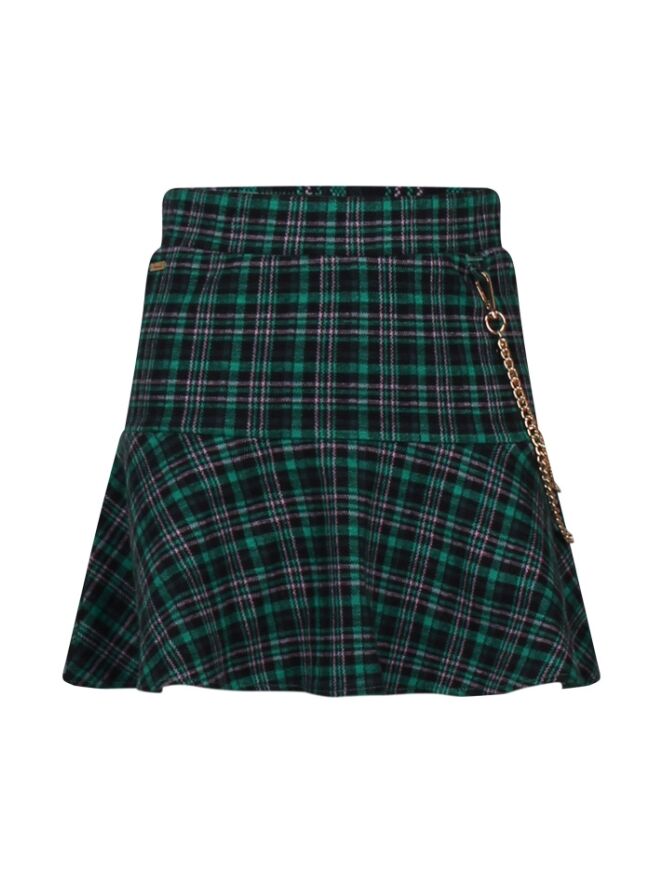 Stoer kort geruit rokje met een elastische tailleband, en een opvallende gouden ketting als leuk detail. Het model is strak aangesloten aan de bovenkant en heeft daaronder een wijd uitlopende strook, wat zorgt voor een speelse en flatterende look. Een trendy en veelzijdig kledingstuk dat perfect is voor een stoere en modieuze outfit!