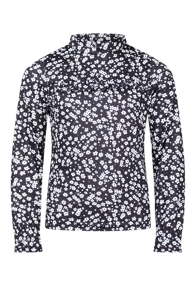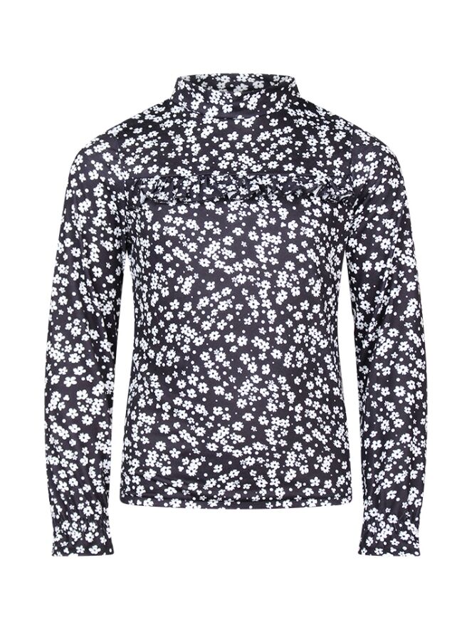 Dit shirt met opstaand kraagje en bloemenprint heeft een elastiek onder in de taille. Voor over de borst loopt een horizontale ruche.