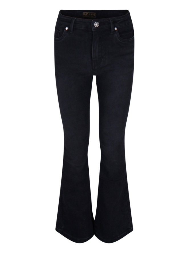 Deze flair jeans voor meisjes is een 5-pocket model. Mocht de taille wat ruim zijn dan kan je met het elastieken koord en knoop de taille innemen. Handig toch?