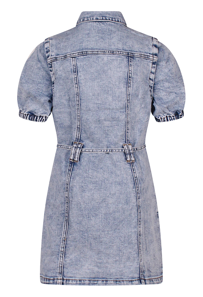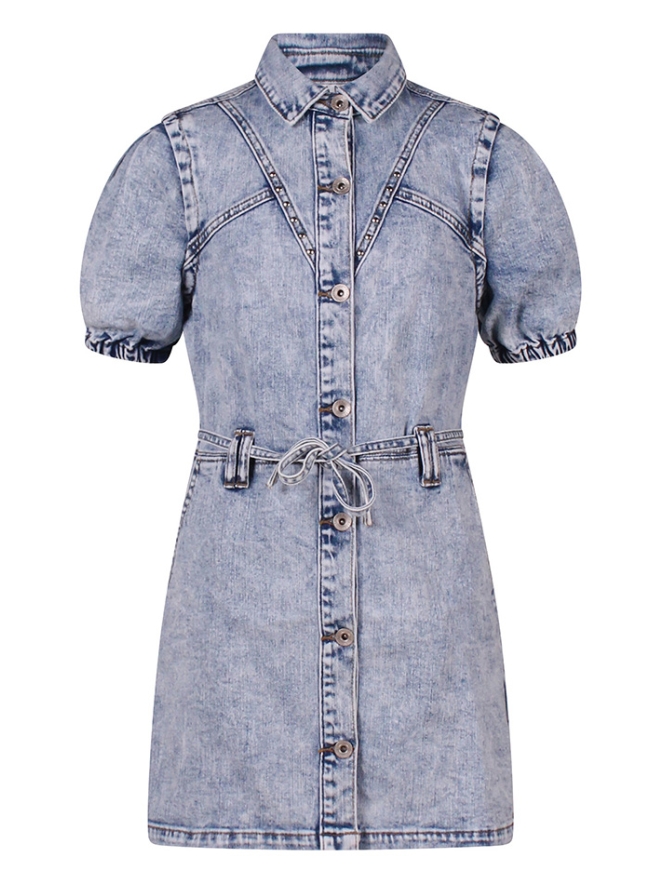Deze meisjes denim jurk heeft stijlvolle deelnaden, pofmouwen en een ceintuur in de taille voor een perfecte pasvorm. Stoere studsdetails aan de voorkant geven de jurk een trendy touch, waardoor het een modieus en veelzijdig item is om te combineren voor een casual of feestelijke look.