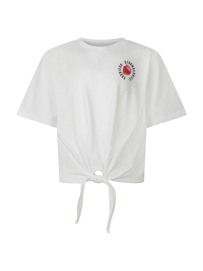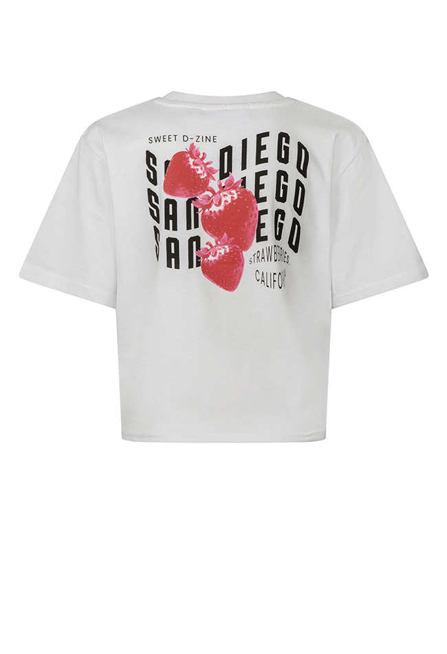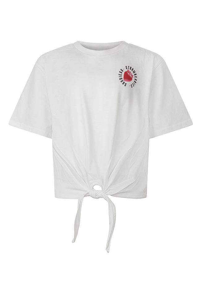 Fris de zomer in met dit geknoopte T-shirt van D-Zine! De vrolijke fruitprint geeft een speelse en zomerse uitstraling, terwijl het knoopdetail voorop een trendy touch toevoegt. Perfect voor warme zomerdagen en casual zomerse outfits. Combineer het met shorts, rokken of jeans voor een vrolijke en relaxte look.
