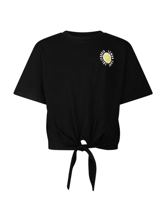 Fris de zomer in met dit geknoopte T-shirt van D-Zine! De vrolijke fruitprint geeft een speelse en zomerse uitstraling, terwijl het knoopdetail voorop een trendy touch toevoegt. Perfect voor warme zomerdagen en casual zomerse outfits. Combineer het met shorts, rokken of jeans voor een vrolijke en relaxte look.