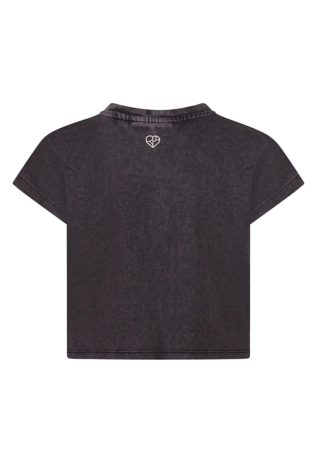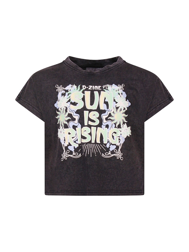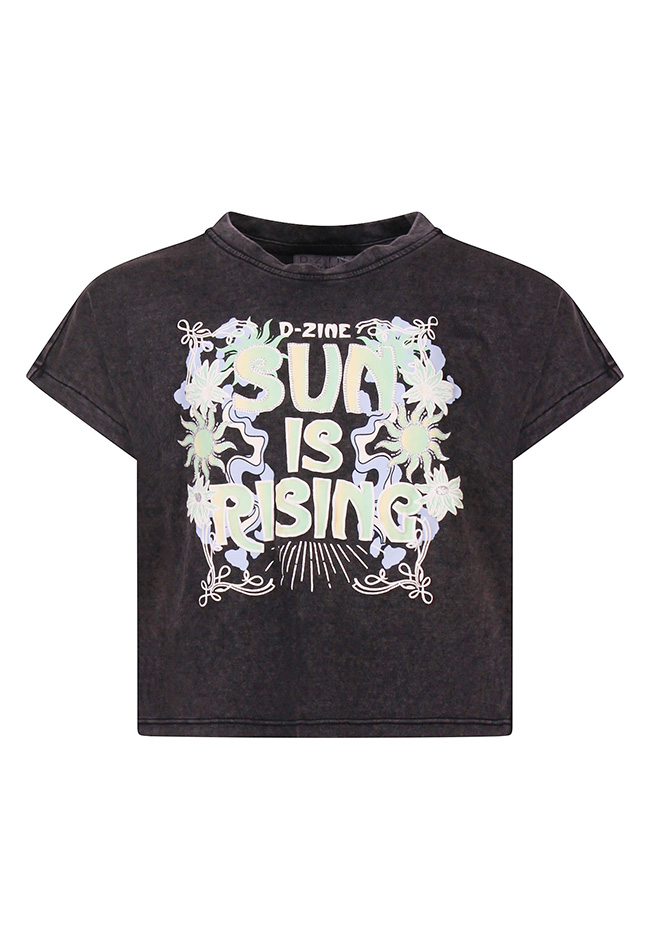 Dit vrolijke T-shirt van D-Zine heeft een Acid wash met een vrolijke Sun is Rising print voorop. Dit shirtje is iets cropped en iets wijder.