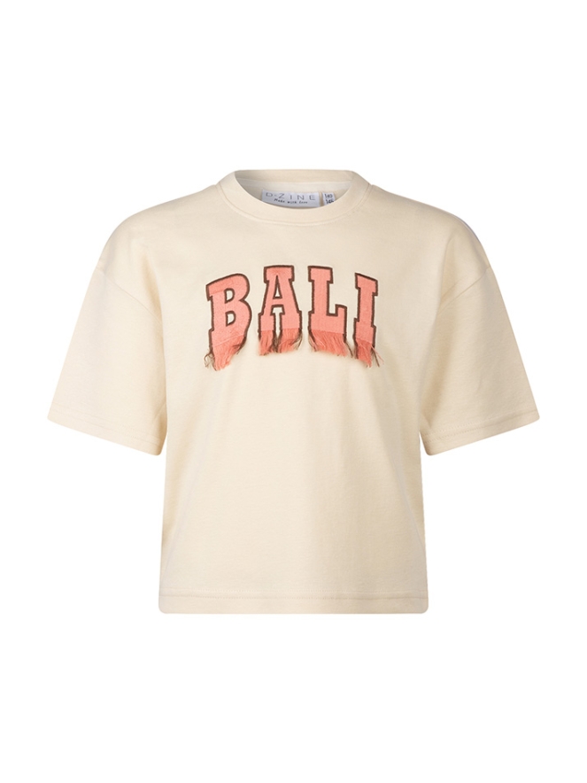 Trendy T-shirt in een boxy fit. Boxy is in zijn geheel wat wijder, dus hou je ervan dat het allemaal wat losser zit dan is dit hét T-shirt voor jou! Met Bali borduring met onder de letters een afgewerkte rafelrand voor een speelse look!