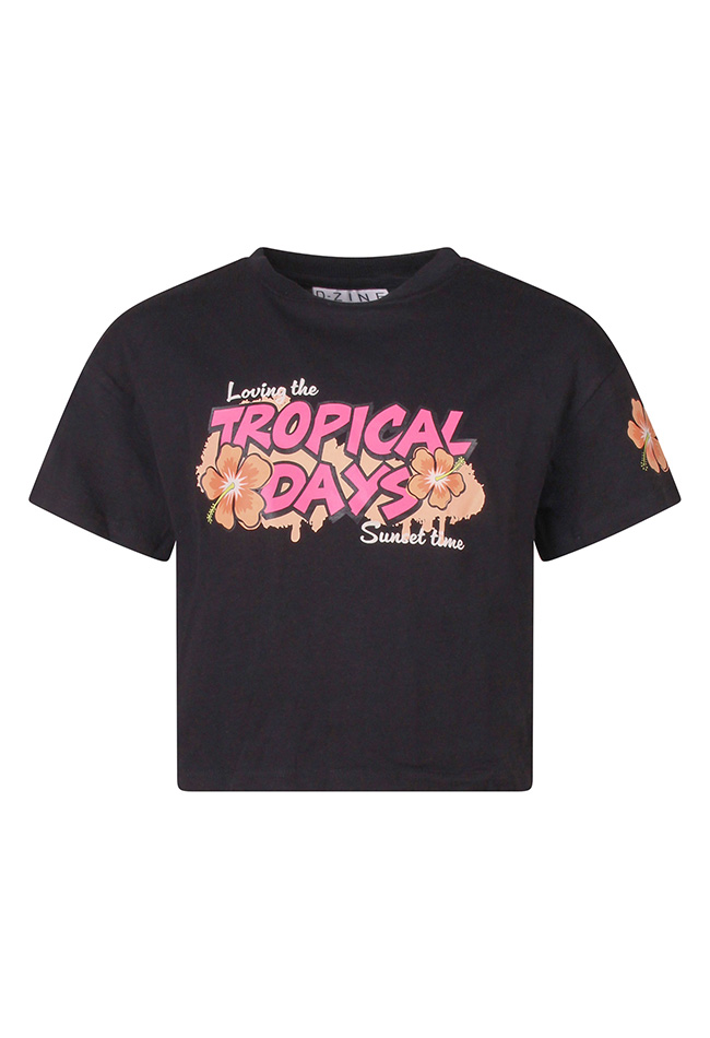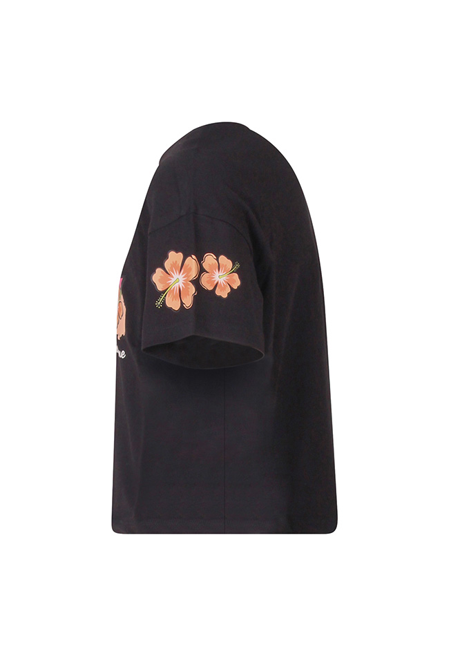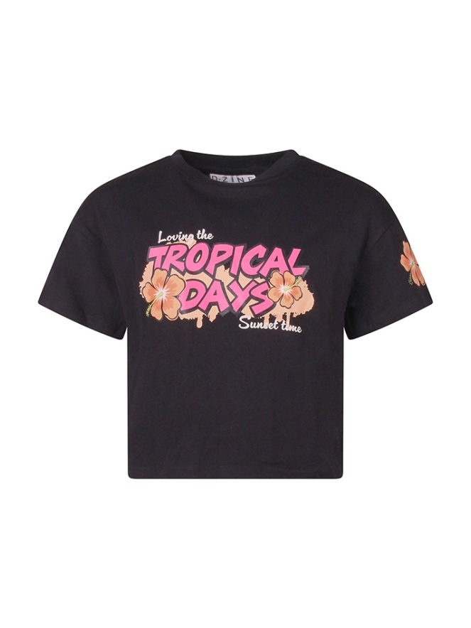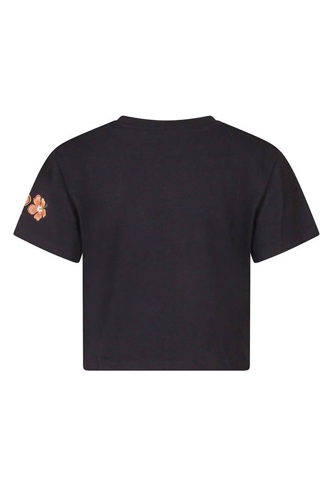Dit T-shirt brengt een tropisch gevoel! De grote, kleurrijke print op de voorkant zorgt voor een echte eyecatcher, terwijl de subtiele bloem op de mouw een charmant detail toevoegt. Perfect om te combineren met shorts, rokjes of jeans voor een vrolijke, zonnige look.