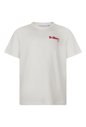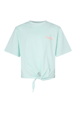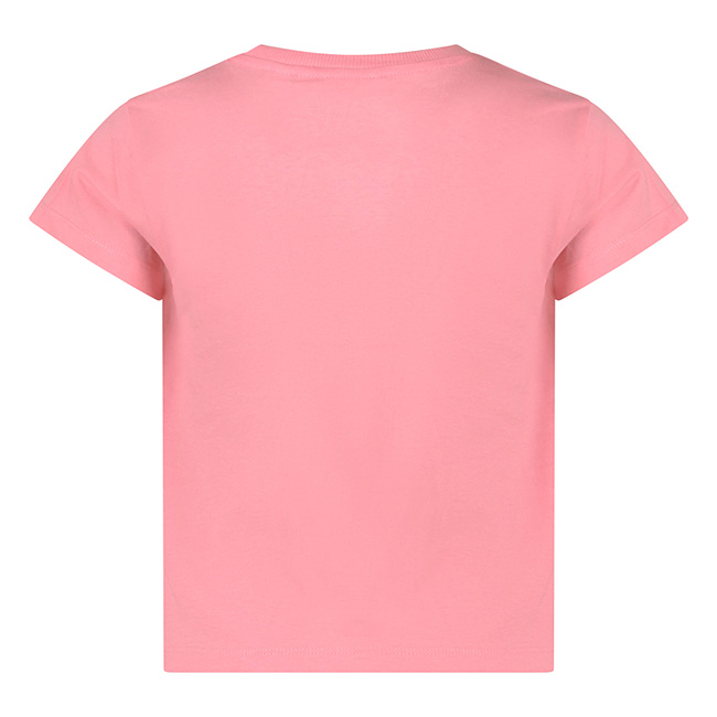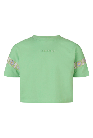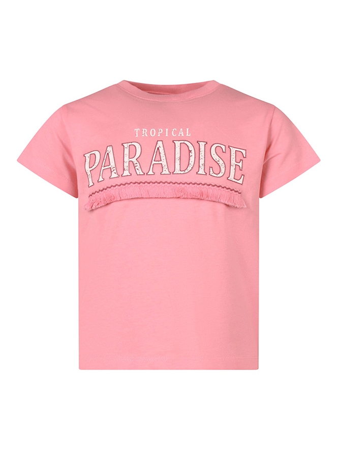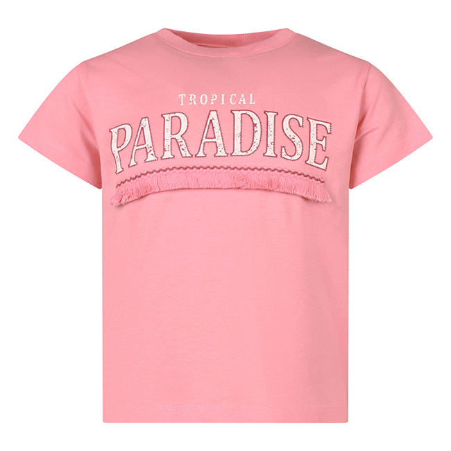 Tropical paradise! Dit T-shirt heeft een tropische tekstprint met een sierlijke opgestikte rafelband. Rafels zijn helemaal trendy dit seizoen en geven een speelse touch!