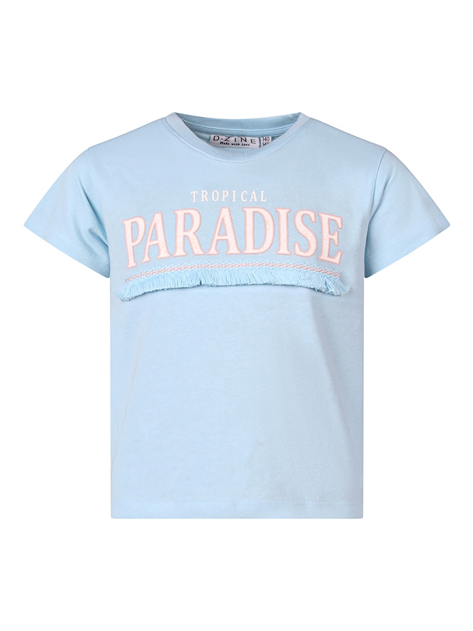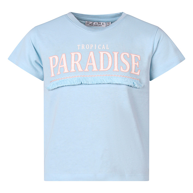 Tropical paradise! Dit T-shirt heeft een tropische tekstprint met een sierlijke opgestikte rafelband. Rafels zijn helemaal trendy dit seizoen en geven een speelse touch!