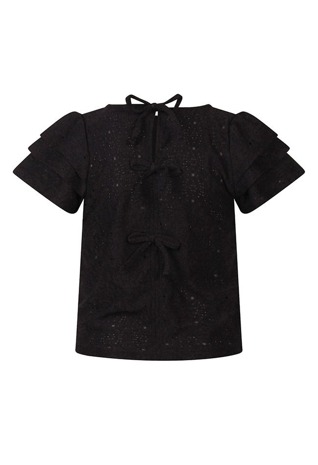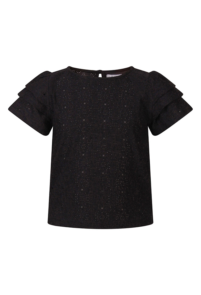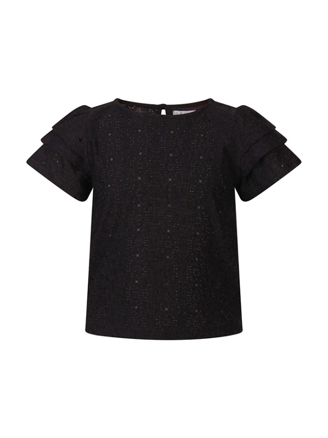 Schattig meisjes shirt met korte mouwen en een speelse uitstraling. De watervalmouwtjes geven het shirt een luchtige en elegante look, terwijl de strikjes op de achterkant zorgen voor een extra leuk en verfijnd detail. Gemaakt van zacht en comfortabel materiaal, ideaal voor zowel alledaagse outfits als iets specialere momenten. Makkelijk te combineren met een rokje, short of jeans voor een vrolijke en stijlvolle look.