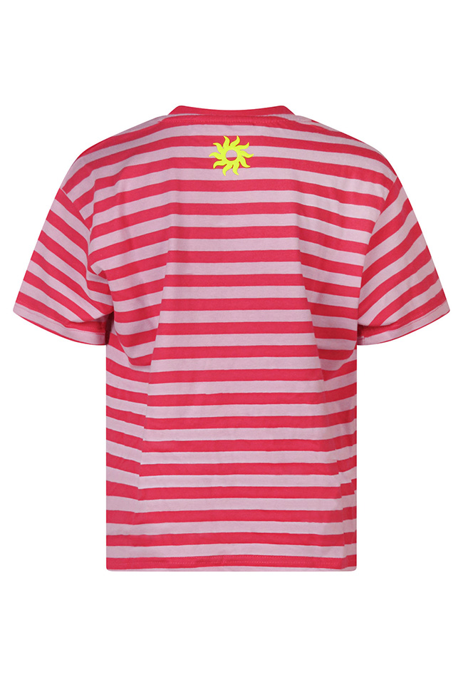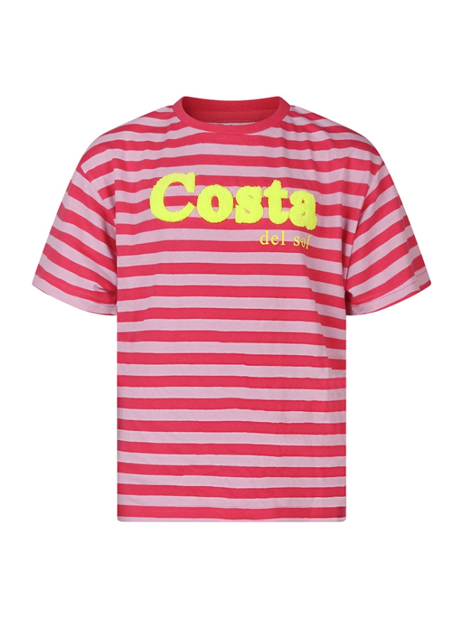 Laat je outfit stralen met dit trendy meisjes T-shirt in frisse zomerstijl! Het shirt is uitgevoerd in een speelse streep en afgewerkt met een opvallende neon frottee applicatie met de tekst Costa del Sol. Dit geeft het T-shirt een vrolijke, zonnige uitstraling die perfect past bij warme dagen en casual looks.