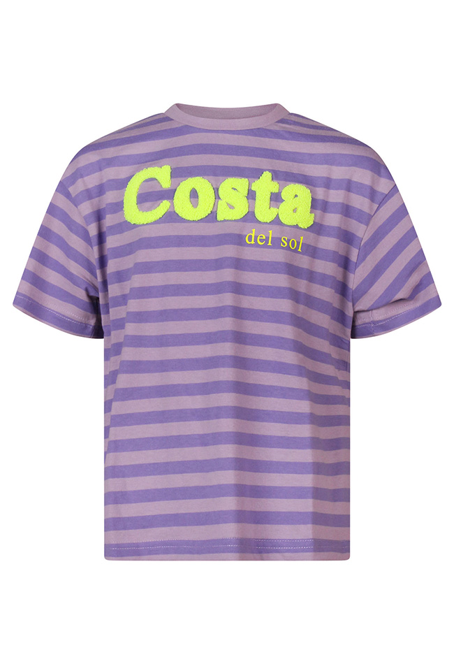 Laat je outfit stralen met dit trendy meisjes T-shirt in frisse zomerstijl! Het shirt is uitgevoerd in een speelse streep en afgewerkt met een opvallende neon frottee applicatie met de tekst Costa del Sol. Dit geeft het T-shirt een vrolijke, zonnige uitstraling die perfect past bij warme dagen en casual looks.