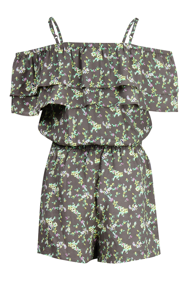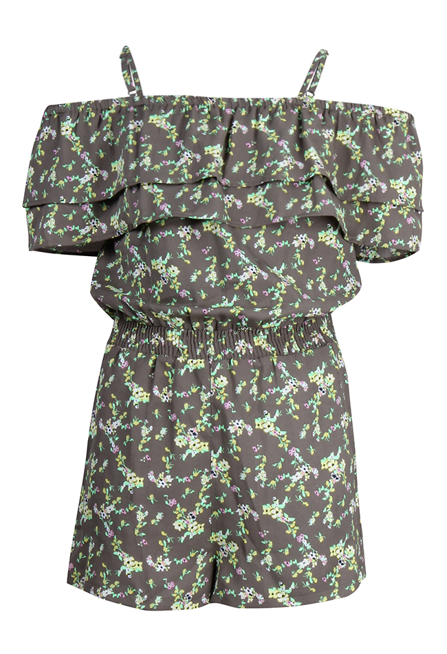 Off the shoulder zomer jumpsuit met bloemenprint voor meisjes. Met korte pijpen en een elastieken tailleband