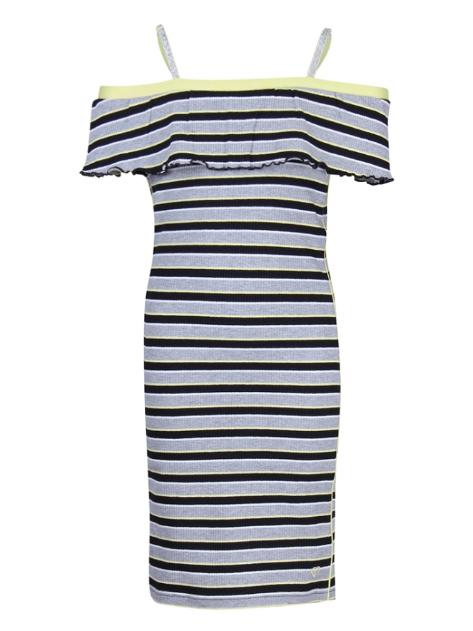 Gestreept off the shoulder jurkje. Het jurkje heeft elastieken glitter banden en ruche over de bovenkant van de jurk. Materiaal: 95% katoen, 5% lycra