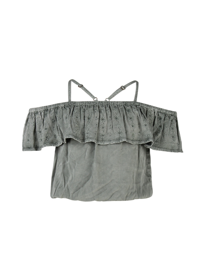 Off the schouder blouse van D-zine. De blouse heeft een broderie ruche band. De blouse heeft spaghetti bandjes en aan de onderkant elastiek. Materiaal: 100% viscose. wassen op 30 graden, niet bleken, niet in de droger, kan gestreken worden.