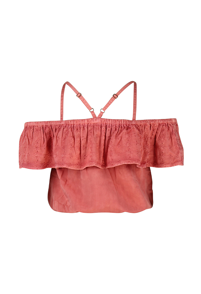 Off the schouder blouse van D-zine. De blouse heeft een broderie ruche band. De blouse heeft spaghetti bandjes en aan de onderkant elastiek. Materiaal: 100% viscose. wassen op 30 graden, niet bleken, niet in de droger, kan gestreken worden.