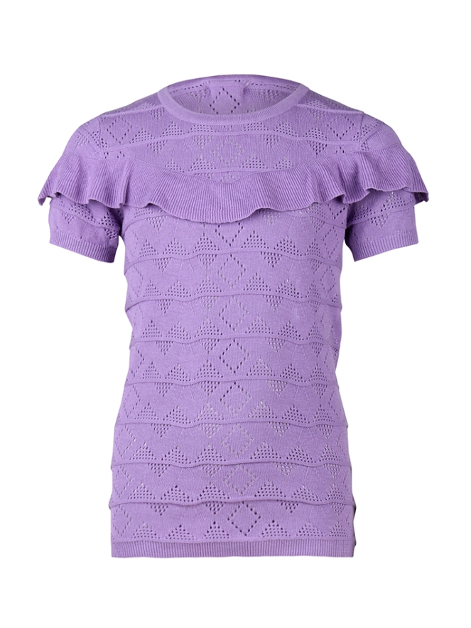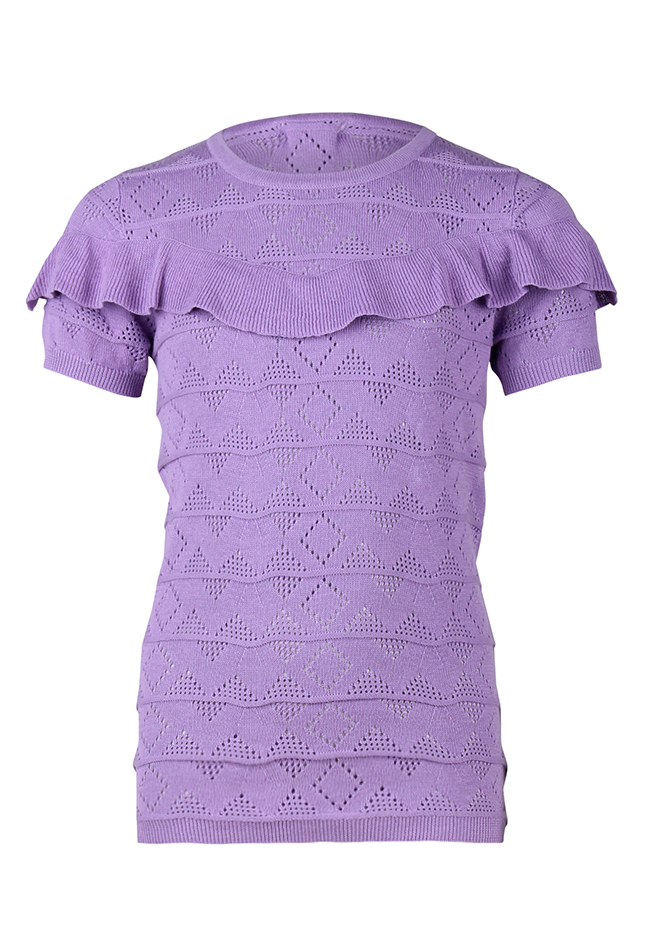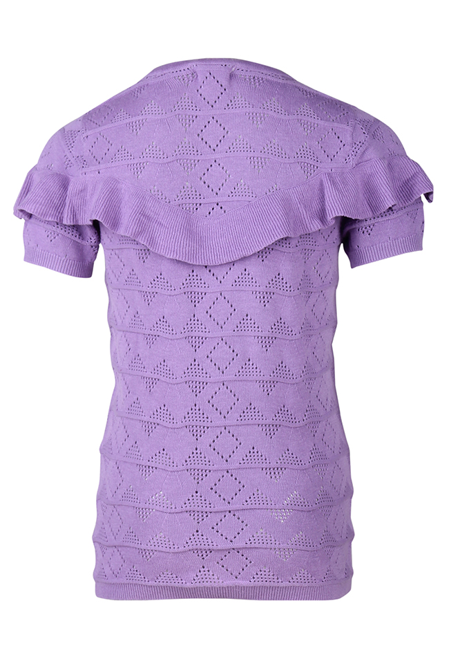 Ajour brei top van D-zine. Het t-shirt is gebreid en heeft een leuk patroon. Er zitten ruche op de voor en achter kant. Materiaal: 100% katoen. wassen op 30 graden, niet bleken, niet in de droger, kan gestreken worden