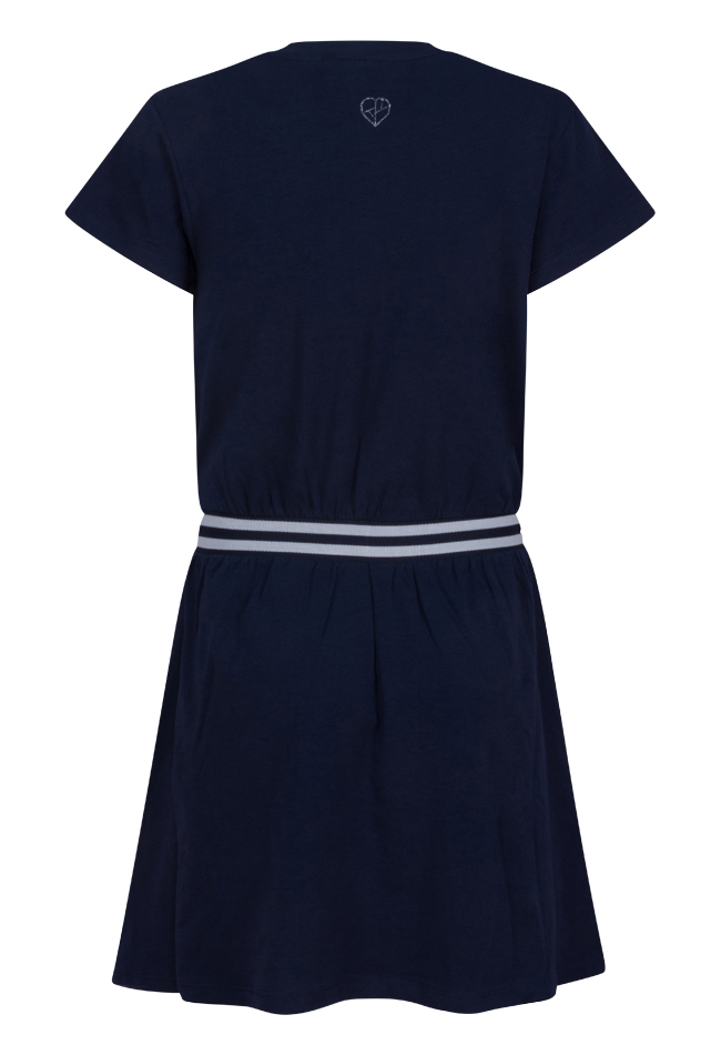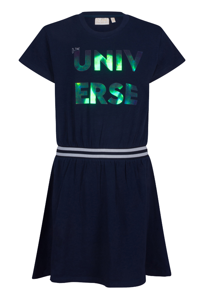Jurk van D-zine. De jurk heeft een elastieken taille band, een uitlopend skater rokje en een holografische tekst op de voorkant. Materiaal: 95% katoen, 5% lycra. Wassen op 30 graden, niet bleken, niet in de droger, kan gestreken worden.