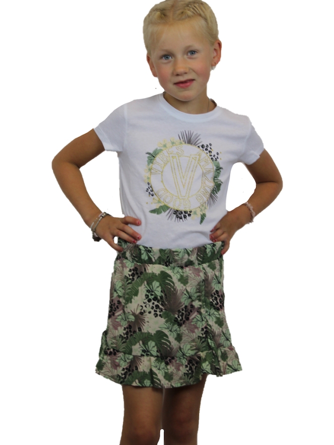 Rokje van D-zine. Het rokje heeft een all over print en een roesel aan de onderkant met aan een van de zijkanten een ophaalkoordje. Valt klein. Materiaal: 98% polyester, 2% elasthan. Wassen op 30 graden, niet bleken, niet in de droger, kan gestreken worden.