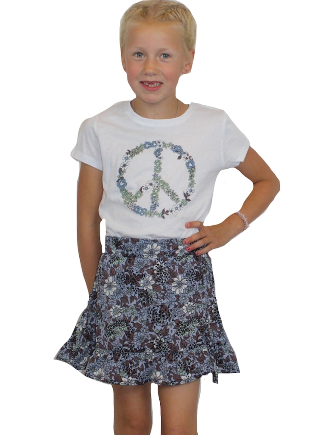 Rokje van D-zine. Het rokje heeft een all over print en een roesel aan de onderkant met aan een van de zijkanten een ophaalkoordje. Valt klein. Materiaal: 98% polyester, 2% elasthan. Wassen op 30 graden, niet bleken, niet in de droger, kan gestreken worden.