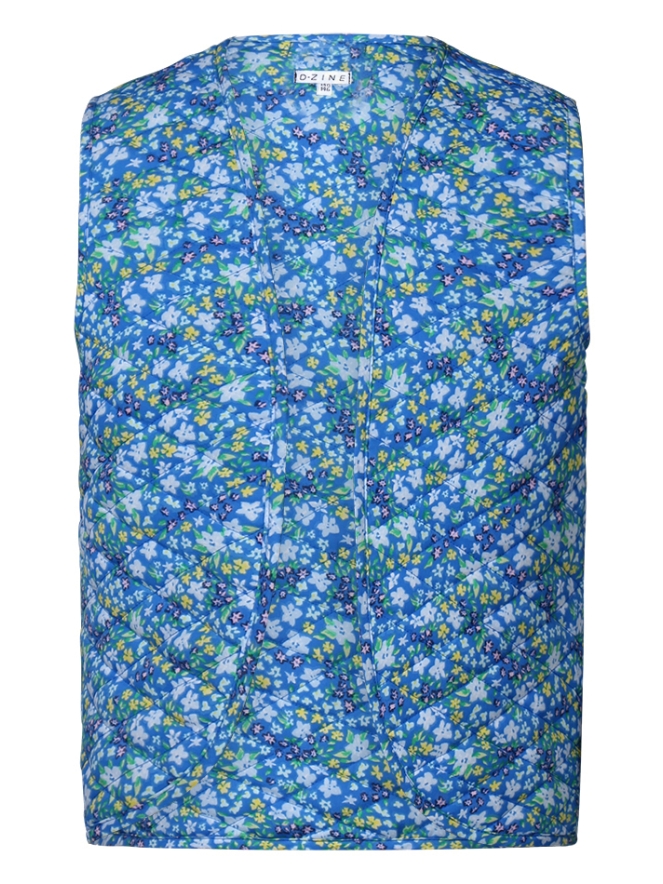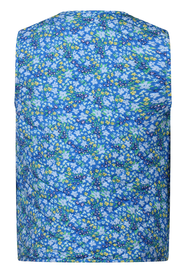 Dit gilet heeft een bloemenprint en is licht gewatteerd met een ruitpatroon.