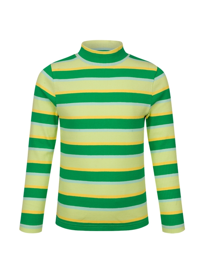 T-shirt met een gestreept patroon met vier verschillende kleuren en heeft een hoge boord bij de hals. Het shirt is aansluitend en aansluitende lange mouwen en is verkrijgbaar in drie verschillende kleuren.