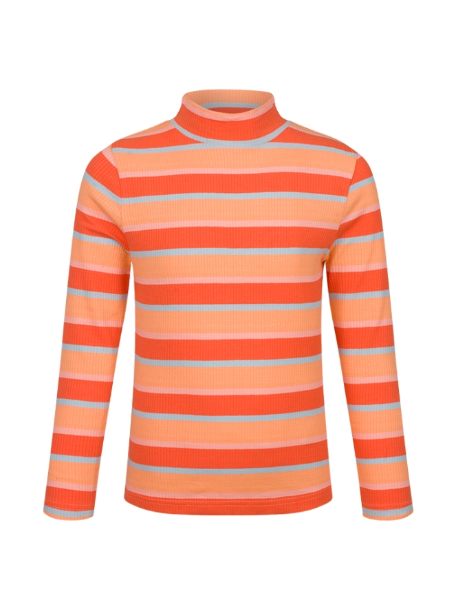 T-shirt met een gestreept patroon met vier verschillende kleuren en heeft een hoge boord bij de hals. Het shirt is aansluitend en aansluitende lange mouwen en is verkrijgbaar in drie verschillende kleuren.