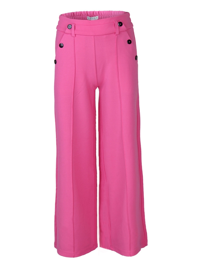 Pantalon van D-zine. Deze pantalon draagt heerlijk doordat hij gemaakt is van een rekbaar materiaal. In de tailleband zit elastiek. Over de voorkant van het been loopt een detailnaad. Voor zitten steekzakken met drie knopen als detail, achter zit een nep paspelzak. Het model heeft wijde pijpen. De pantalon is verkrijgbaar in 4 kleuren.
