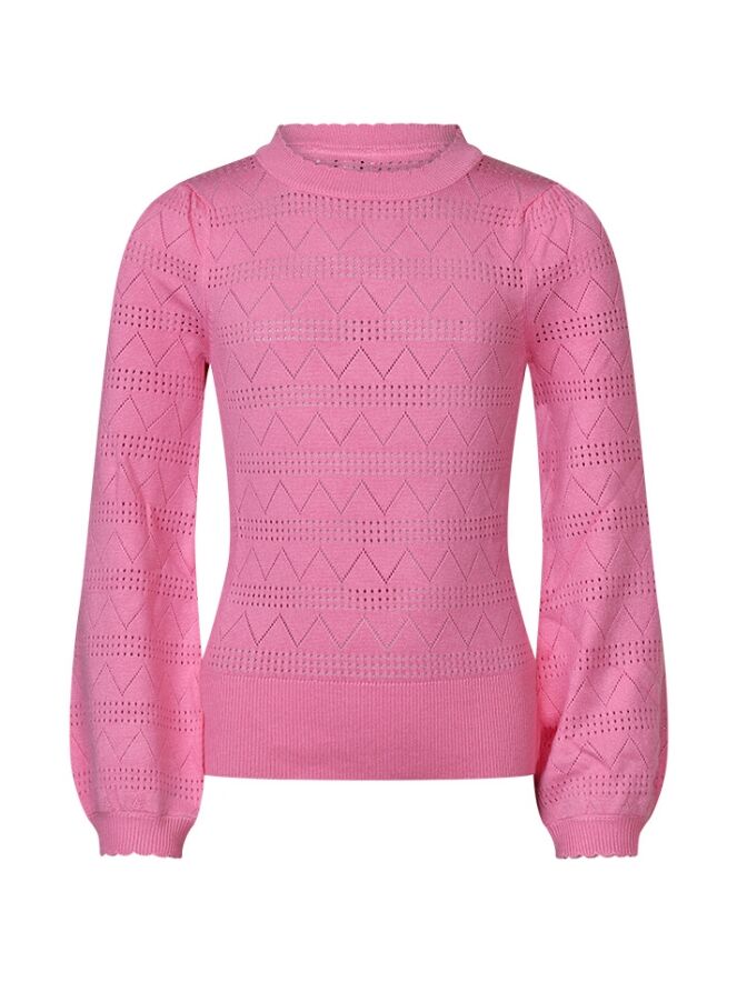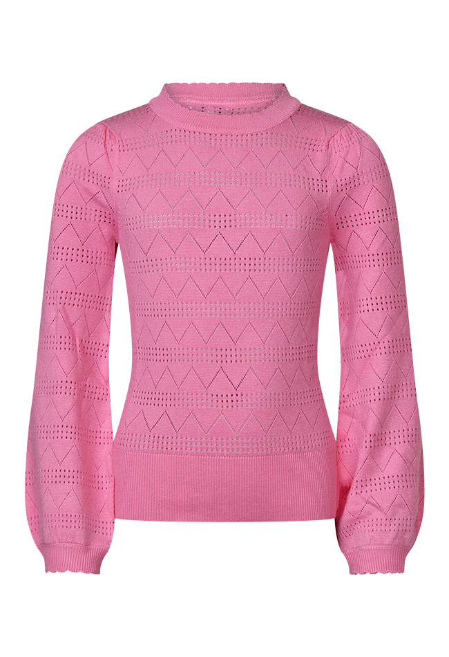 Gebreide pullover van D-zine. De trui heeft een all over ajour brei patroon en sculp randjes bij de mouwen en hals. De trui heeft een ballon mouw. Materiaal: 70% viscose, 30% nylon. Wassen op 30 graden, niet bleken, niet in de droger, kan gestreken worden.