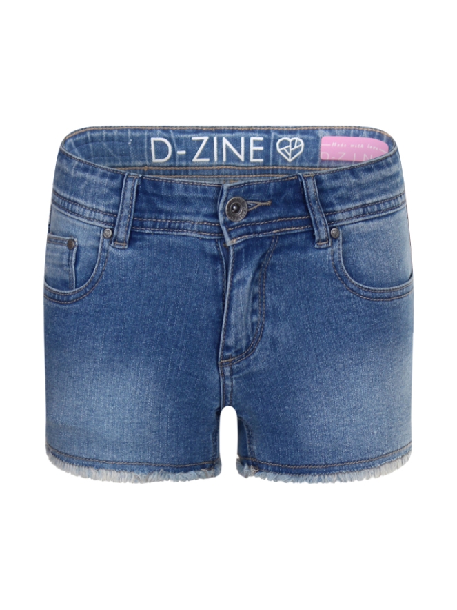 5-pocket short met in de tailleband een elastiek om de taille strakker te maken en rafeltjes aan de onderkant van het short.