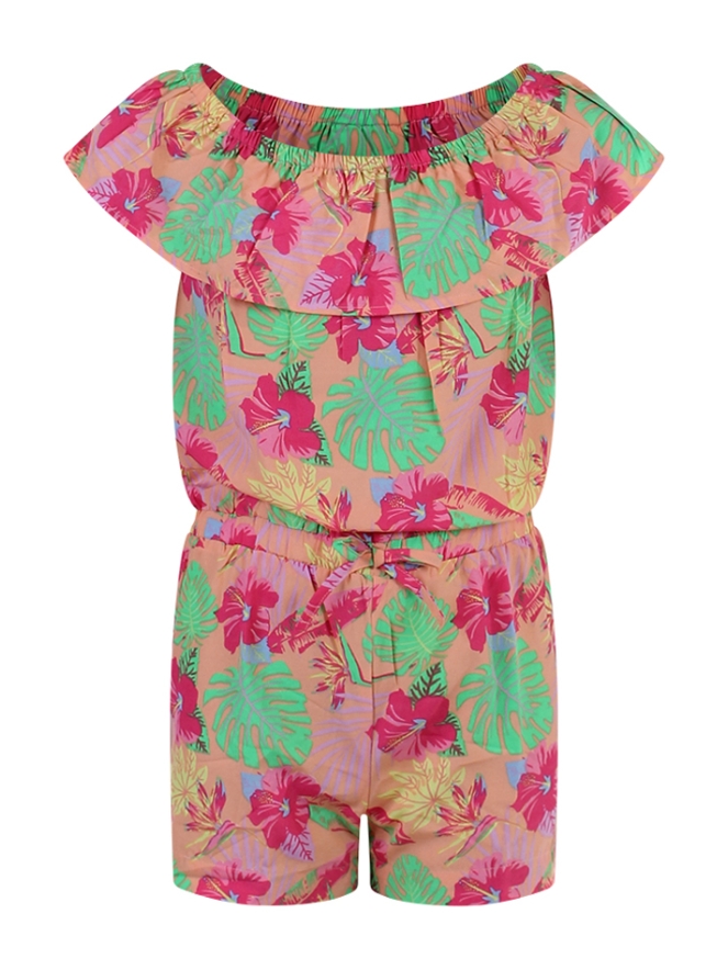 Jumpsuit met een allover bloem/bladerprint. De jumpsuit heeft een off shoulder en een elastische tailleband met strik detail.