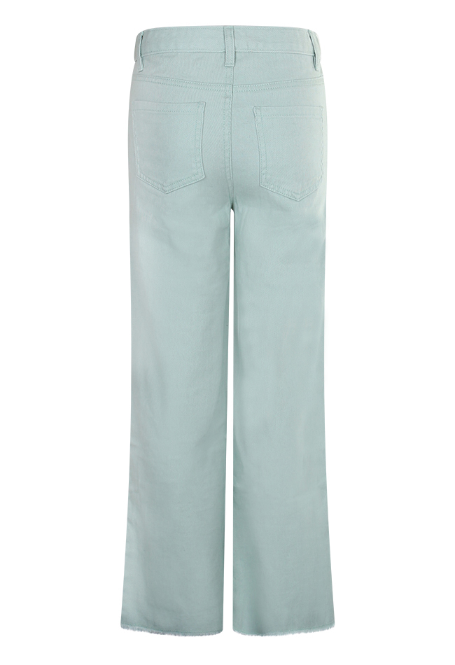 Deze five pocket jeans heeft een rits en een schuifknoop. De jeans heeft een hoge taille aan de binnenkant zit een elastiek om de taille strakker te maken. De jeans heeft rechte wijde pijpen met aan de onderkant een raw edge en is verkrijgbaar in twee kleuren.