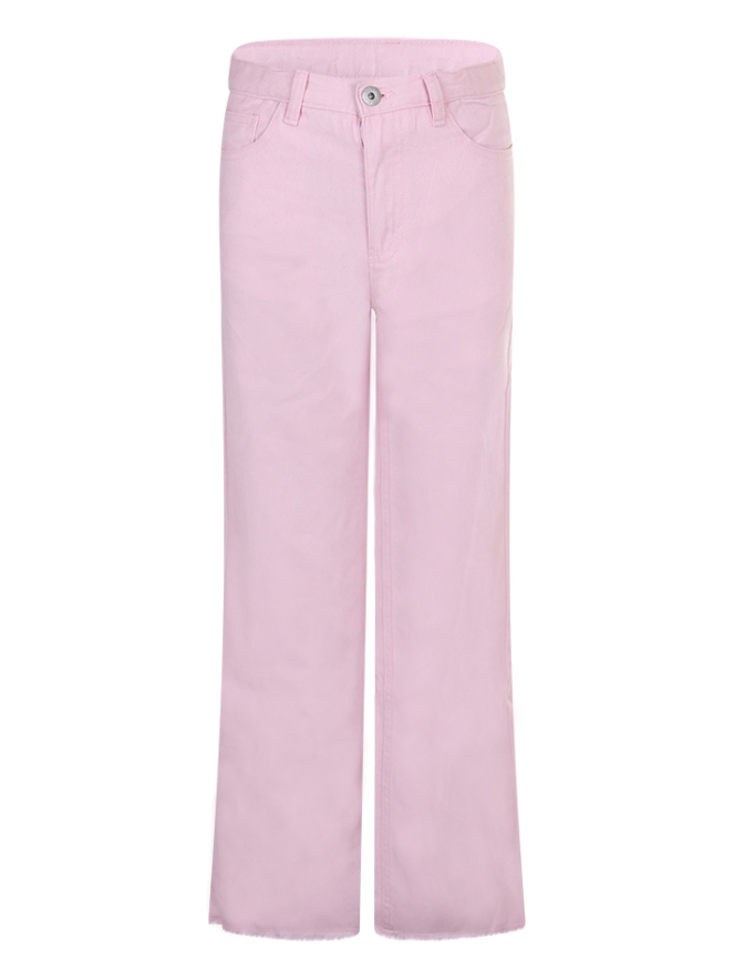 Deze five pocket jeans heeft een rits en een schuifknoop. De jeans heeft een hoge taille aan de binnenkant zit een elastiek om de taille strakker te maken. De jeans heeft rechte wijde pijpen met aan de onderkant een raw edge en is verkrijgbaar in twee kleuren.