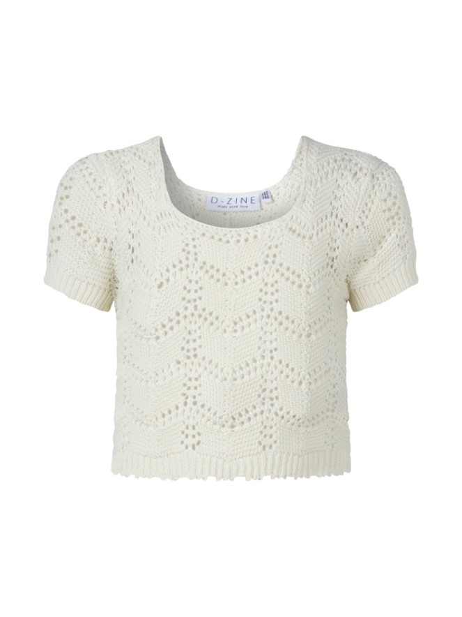 Deze top met korte mouw heeft een opvallende hals en doorzichtig door het ajourbreisel.