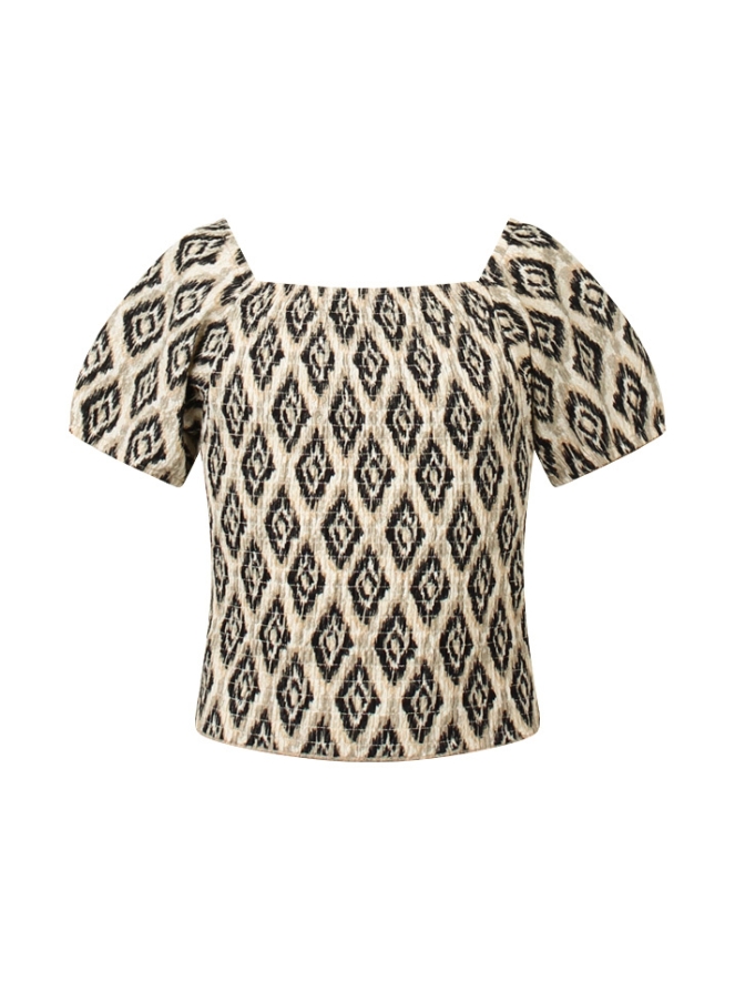 Deze top met korte mouwen heeft pofmouwen en een ikatdesign. In het zelfde patroon is er ook een rokje, broek, short en jurk verkrijgbaar. Art.nummers Rok Z80047 Broek Z80058 Short Z80060 Jurk Z80178