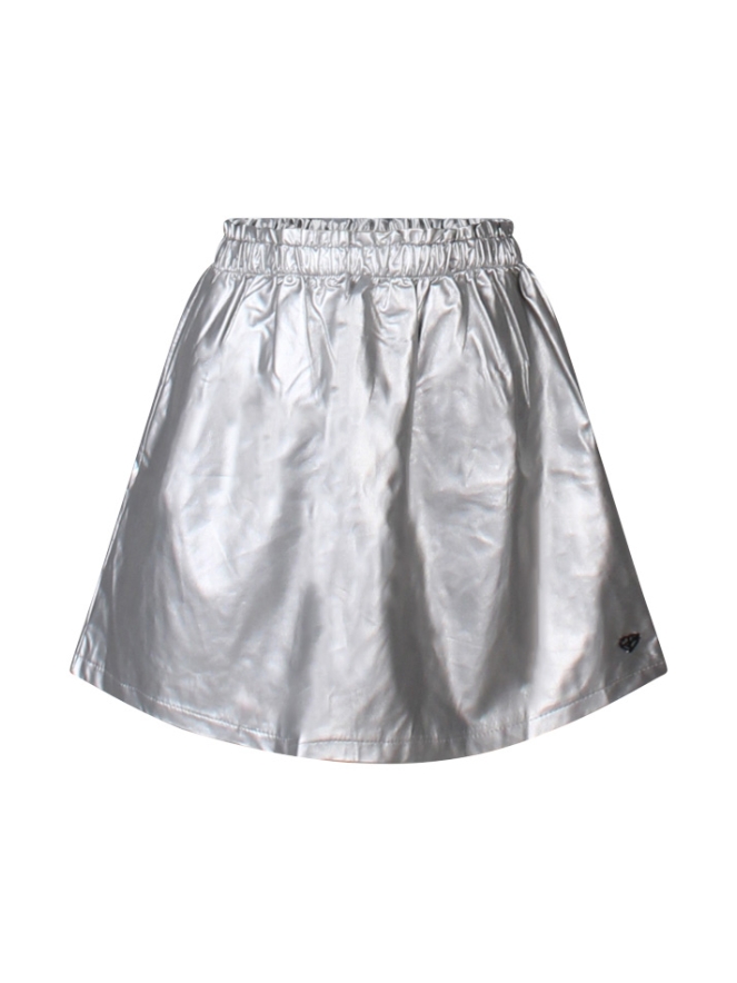 Dit metalic leer look a like rokje is een paperbag model met elastische tailleband.
