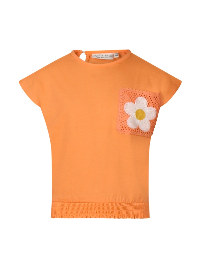 Dit shirt heeft een smockband rond de middel en een gehaakt bloem zakje. Op de achterkant ter hoogte van de hals zit een kleine druppeluitsparing.
