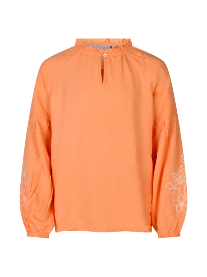 Deze ruimvallende top met ballonmouwen heeft een bloem borduursel op beide mouwen. Rond de kraag zit een ruche rand en voor bij de hals een uitsparing met een knoopje. Precies dezelfde top is ook verkrijgbaar in damesmaten met art.nr. Z80268