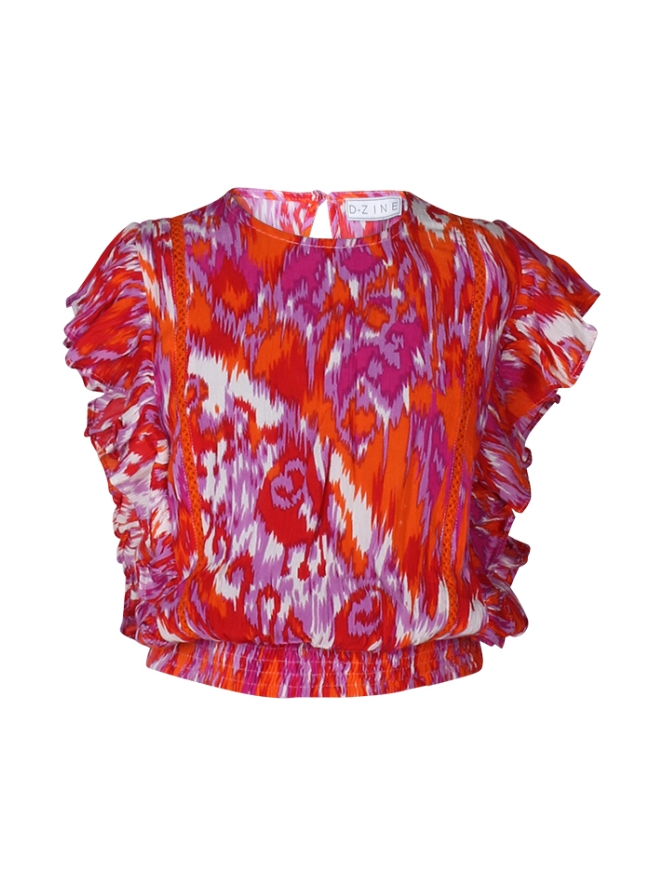 Wij zijn fan van deze print! Ikat is nog steeds een mode trend en vooral in de zomer maanden. Deze top met lange ruche die helemaal over de schouder loopt voegt net dat speelse accent toe. De top heeft in de taille een elastische band waardoor hij iets cropped korter kan vallen. Combineer met de leuke bijpassende short of het rokje en je hebt een leuke 2-delige set.