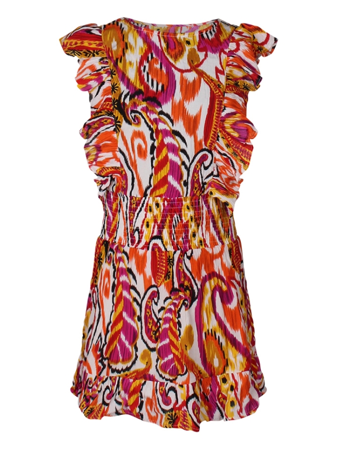 Time to shine! Dit zomerse jurkje voor meisjes van D-Zine heeft een frisse kleurrijke Ikat print met vierkante hals. Net even wat anders! In de taille zit een brede elastische smockband. Dit jurkje is luchtig voor zomerse dagen, heeft een dun katoenen onderrokje en brede schouderbandjes met ruche. Toppertje!