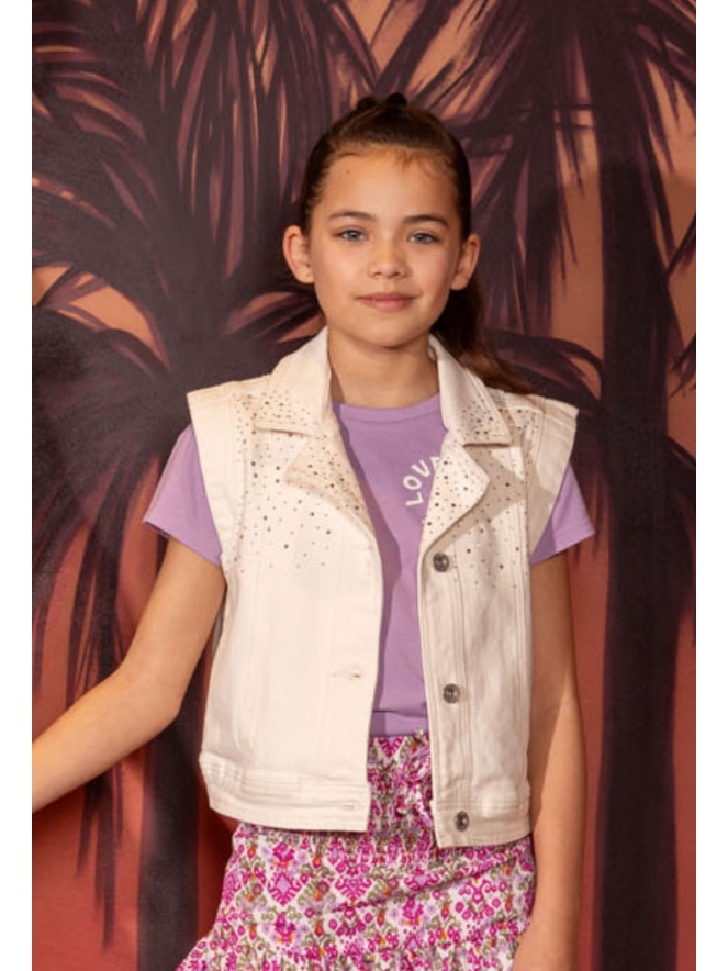 Mega tof spijker gilet van ons eigen merk D-Zine. Hou je van een beetje bling? Dit giletje heeft strass steentjes in zilver en rosé. Met mooie reverskraag en leuke details. Ontzettend leuk op een rokje of ga in een compleet spijker glitter pak met de bijpassende broek onder art.nr. Z90033