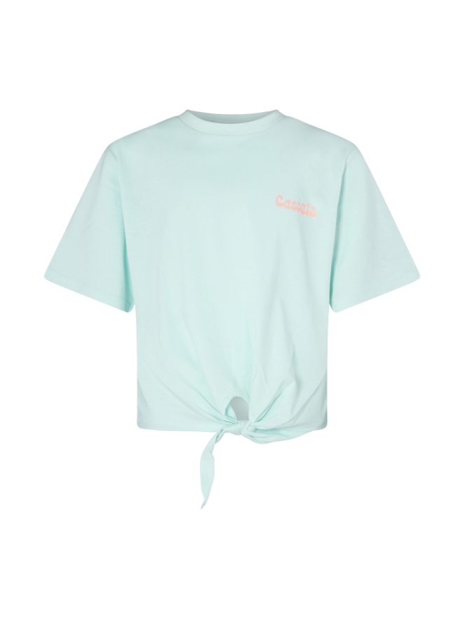Dit leuke meisjes T-shirt is een echte eyecatcher! De opvallende rugprint en geknoopte details geven het shirt een speelse, trendy look.