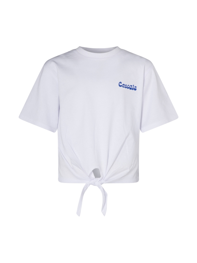 Dit leuke meisjes T-shirt is een echte eyecatcher! De opvallende rugprint en geknoopte details geven het shirt een speelse, trendy look.