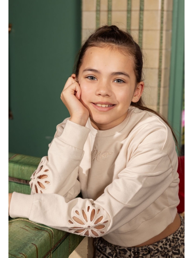 Bloom! Deze sweater is een kort cropped model en heeft een open borduursel onder aan de mouw. Deze is voor de blote buiken dragers een trendy item op zonnige dagen.