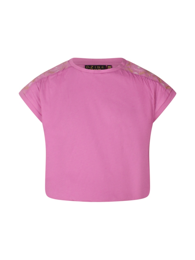 Mooi T-shirt met borduursel op de schouder en een omgeslagen mouwtje. Het shirt heeft een ballonmodel en heeft dus een elastiek in de middel. Daardoor is hij wat korter ofwel cropped. Leuk op rokjes en shorts!