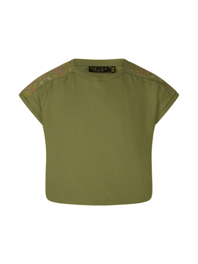 Mooi T-shirt met borduursel op de schouder en een omgeslagen mouwtje. Het shirt heeft een ballonmodel en heeft dus een elastiek in de middel. Daardoor is hij wat korter ofwel cropped. Leuk op rokjes en shorts!