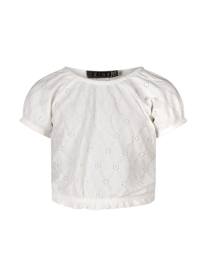 Als het straks echt zomer is is dit je grote favoriet! Deze mooie top met wijde hals heeft een pofmouw en is van een mooie ajour stof. De top is iets korter ofwel cropped en heeft in de middel een elastiek om hem nog iets extra te kunnen laten plooien.