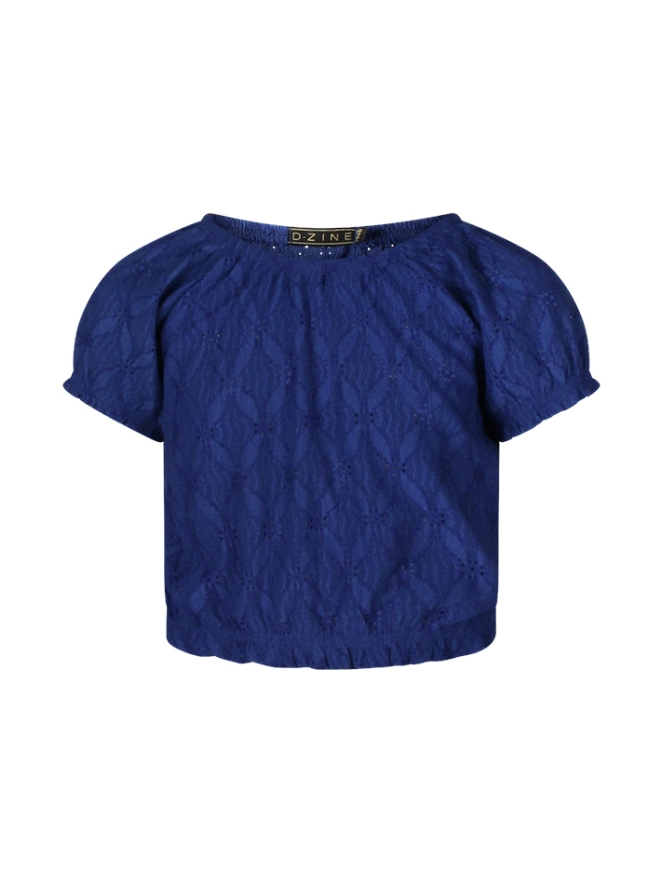 Als het straks echt zomer is is dit je grote favoriet! Deze mooie top met wijde hals heeft een pofmouw en is van een mooie ajour stof. De top is iets korter ofwel cropped en heeft in de middel een elastiek om hem nog iets extra te kunnen laten plooien.