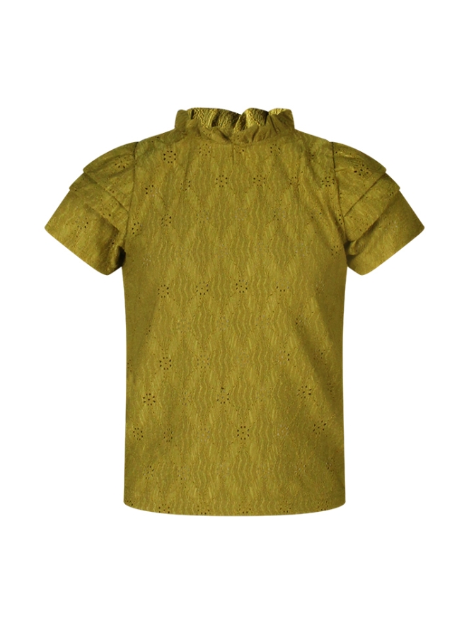 Deze fancy ajour top met een watervalmouw heeft een mooie ruche ronde de hals. Dit shirt schijnt een beetje door door de ajour stof. Leuk te combineren met een giletje of spijkerjasje op een rokje of broek kort of lang!